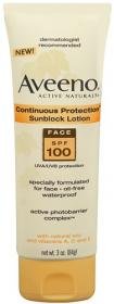 Aveeno Continuous Protection Sunblock Lotion for the face with SPF 100+ is formulated to provide superior, long-lasting protection against skin damage caused by the sun. This exclusive formula, which combines Active Photobarrier Complex(tm) to maintain broad spectrum sun protection over time, with natural soy protein and vitamin E, helps shield your skin from environmental damage. Oil-free and noncomedogenic, it absorbs quickly for a sheer, lightweight finish, and is also hypoallergenic and waterproof.