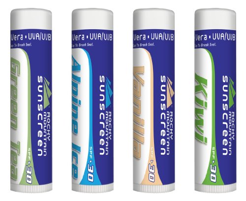 Rocky Mountain sunscreen four pack lip balm helps prevent sunburn with 4 unique flavors alpine ice, kiwi, vanilla and green tea. This SPF-30 lip balm soothes irritation while helping to prevent and protect dry chapped lips with aloe vera and vitamin E.