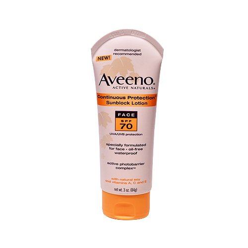 Aveeno Continuous Protection Sunblock Lotion for the fact with SPF 70 is formulated specifically for the face and to provide better, longer-lasting sun protection. Unlike ordinary sunscreens, this formula combines patented Active Photobarrier Complex(TM), which maintains protection over time against the sun's harmful rays with natural soy proteins and vitamins A, C and E to help shield your skin from environmental damage. This oil-free, non-greasy formula is also hypoallergenic, noncomedogenic and waterproof.