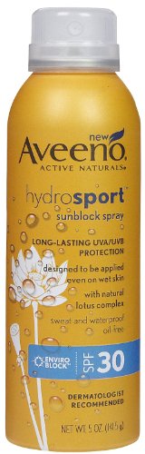Hydrosport sunblock spray by Aveeno retains SPF after 80 minutes of activity in the water or perspiring, provides high protection against sunburn, for skin highly sensitive to sunburn. Sweatproof and waterproof. Dermatologist recommended. Broad spectrum UVA/UVB protection.